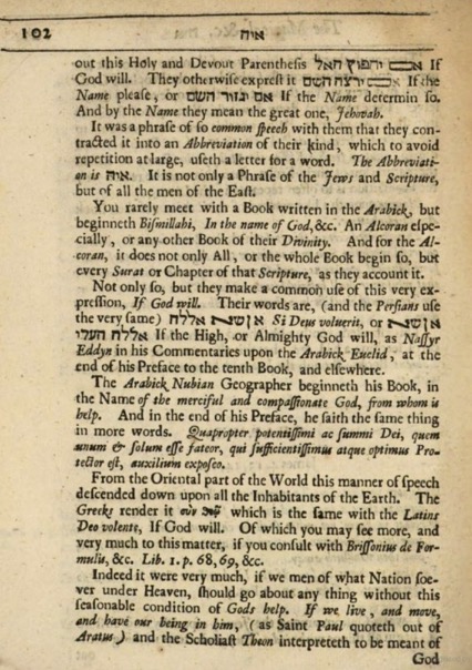Gregory (possibly drawing from Johannes Drusius, an earlier British Orientalist) notes the “custome among the Jewes, especially and first to begin all things with God,” specifying three expressions Jews use – “if God will” (אם יחפוץ האל), “if the Name please” (אם ירצה השם) and “If the Name determine so” (אם יגזור השם), and even pointing out the frequent acrostic, איה, which stands for all three expressions, and serves as the title of his chapter (as seen on the headers of the relevant pages).