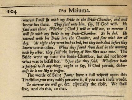 Given the strong Christian tendency to understand its norms as authorized by Hebrew scriptures, it is not surprising that Gregory puts his historical scholarship to the work of establishing a prophetic origin to this teaching. “The Jewes gave the first example, and they themselves brought it into use.” He cites the Aramaic Alphabet of Ben Sira, a medieval Jewish text composed in a Muslim context, but presenting itself as having been authored by Ben Sira--“beleeved by them to be Jeremie the Prophets Nephew”—in biblical times. The Alphabet tells the story of a groom who refused to say “God-willing” about his plans to be with his bride that evening, resulting in the death of both bride and groom. The bishop concludes: “Whosoever hath a purpose to doe any thing ought to say If God permit, Otherwise he is not like to prosper.”